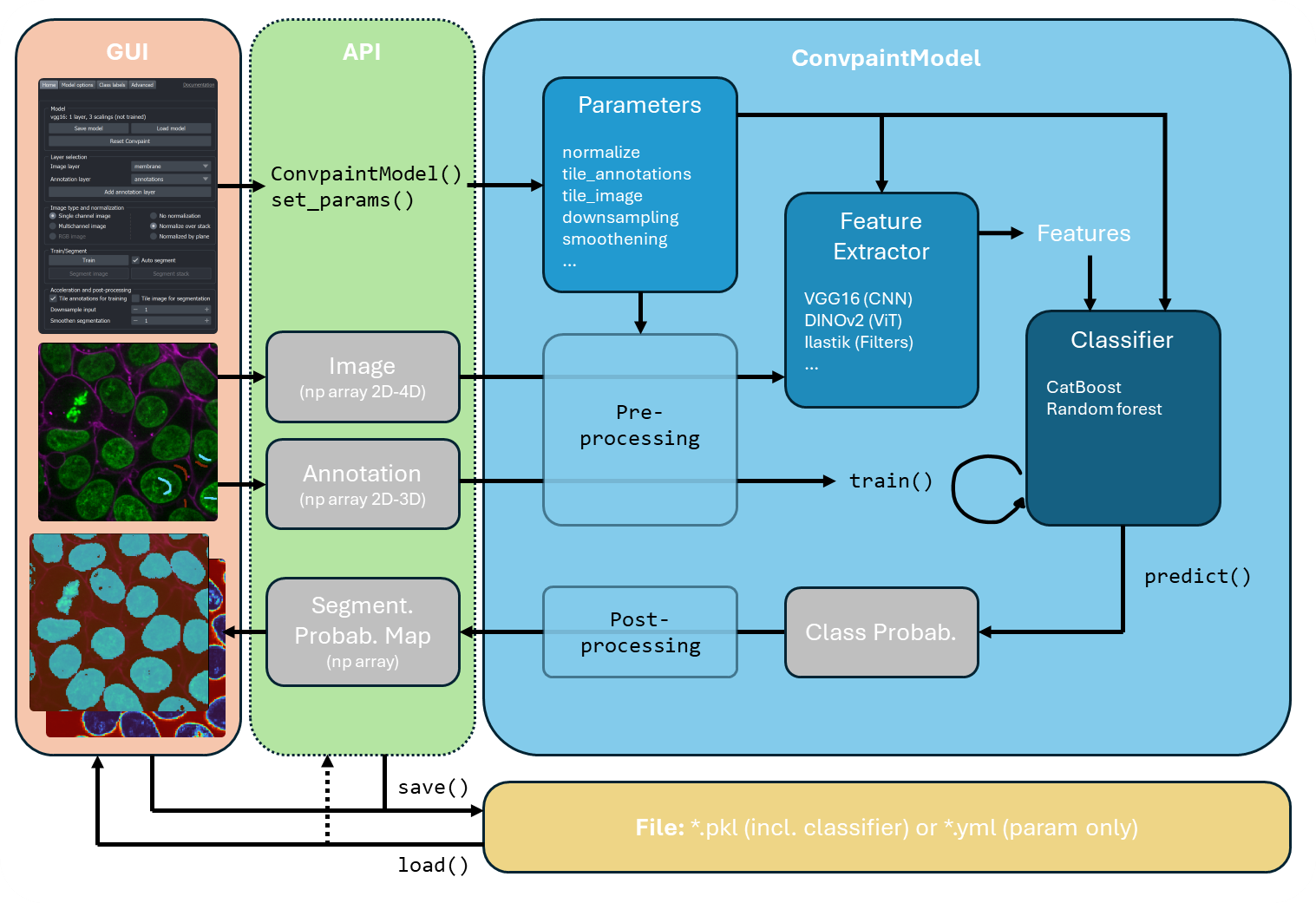 The ConvpaintModel class is the core of Convpaint and combines feature extraction with pixel classification.